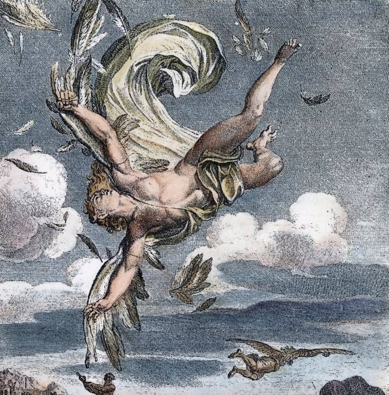 In the traditional narrative, Icarus ignored his father’s warnings, soaring too high into the sky. The wax melted, and he plunged into the sea and drowned.